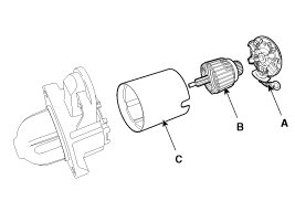 4. Remove the brush holder assembly (A), armature assembly (B) and yoke assembly (C).