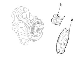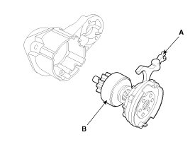 Make sure there is no continuity between the (+) brush holder (A) and (-) plate (B). If there is continuity, replace the brush holder assembly.