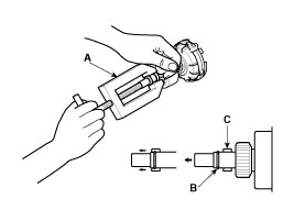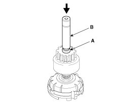 Using a suitable pulling tool (A), pull the overrunning clutch stopper (C) over the stop ring (B).