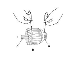 9. Check with an ohmmeter that no continuity exists between the commutator (A) and armature coil core (B), and between the commutator and armature shaft (C). If continuity exists, replace the armature.