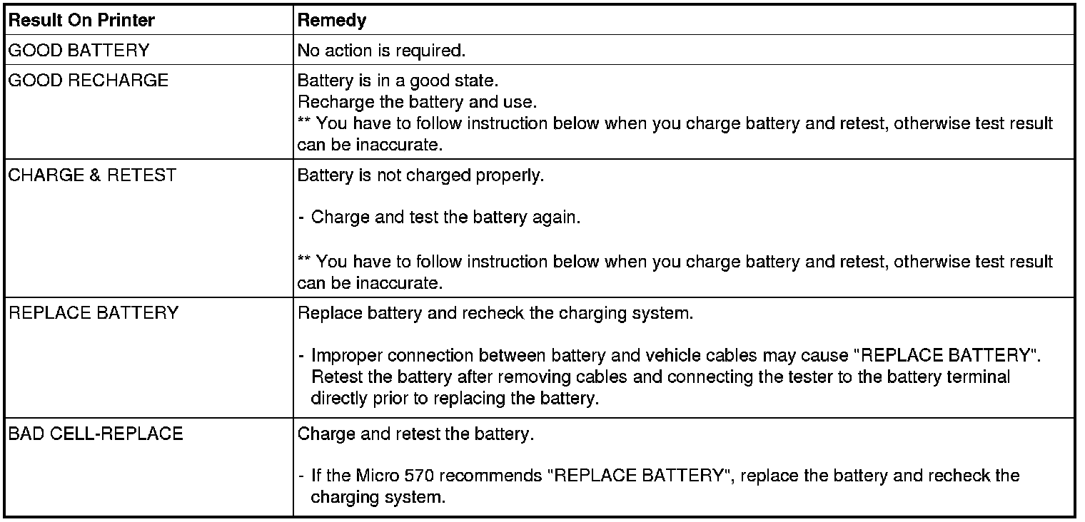 Shut off engine end disconnect the tester clamps from the battery. Refer to the following table and take the appropriate action as recommended by the Micro 570.
