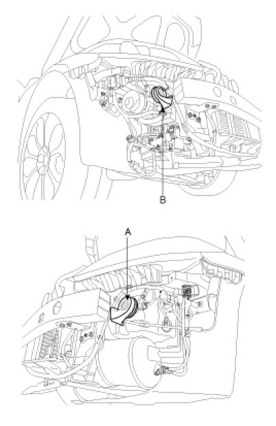 2. Remove the bolt and disconnect the horn connector, then remove the high pitch horn (B) and low pitch horn (A).