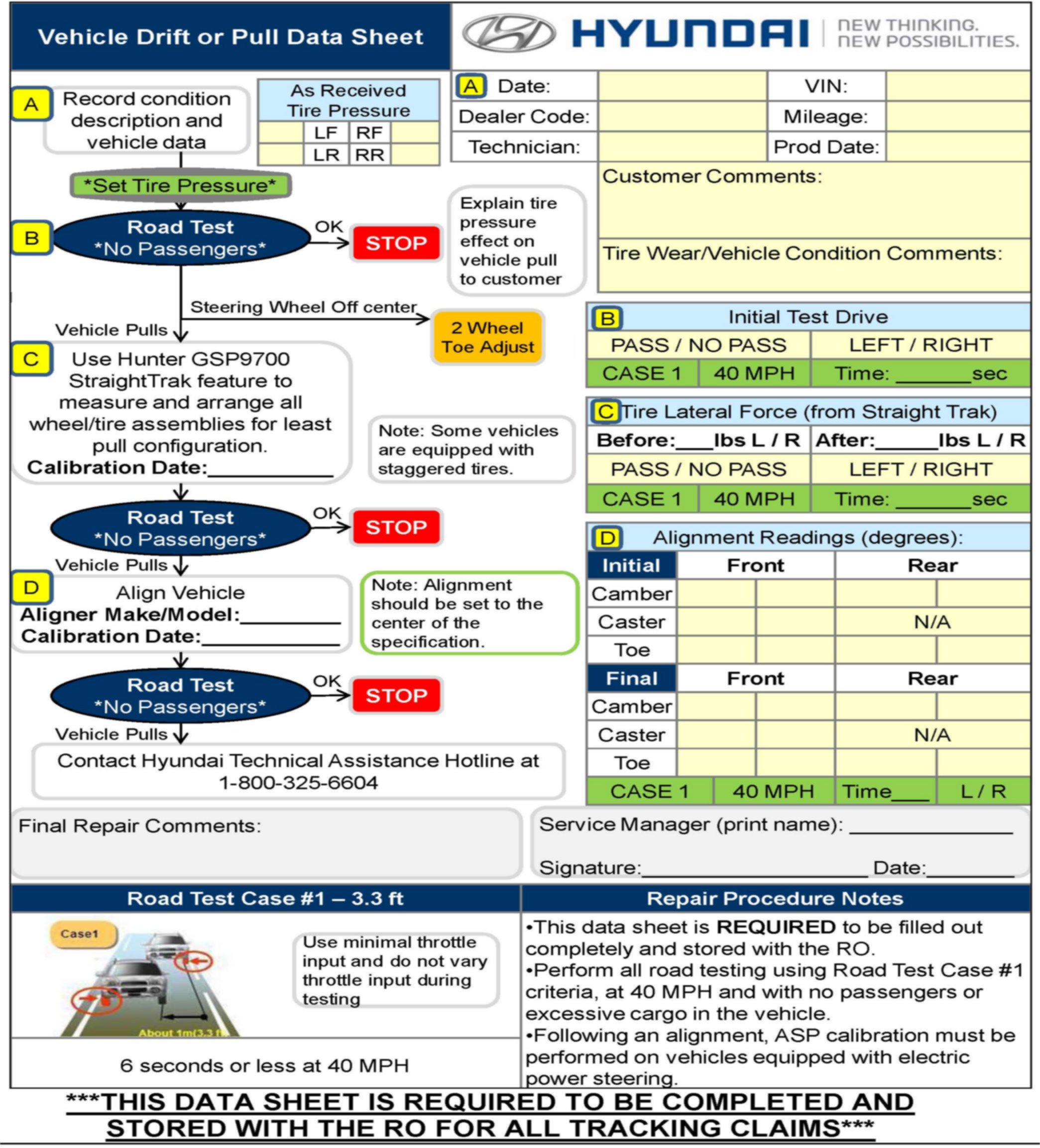 For all vehicle drift, pull and/or alignment warranty claims, the Vehicle Drift/Pull Data Sheet must be filled out as completely as possible and attached to the repair order.