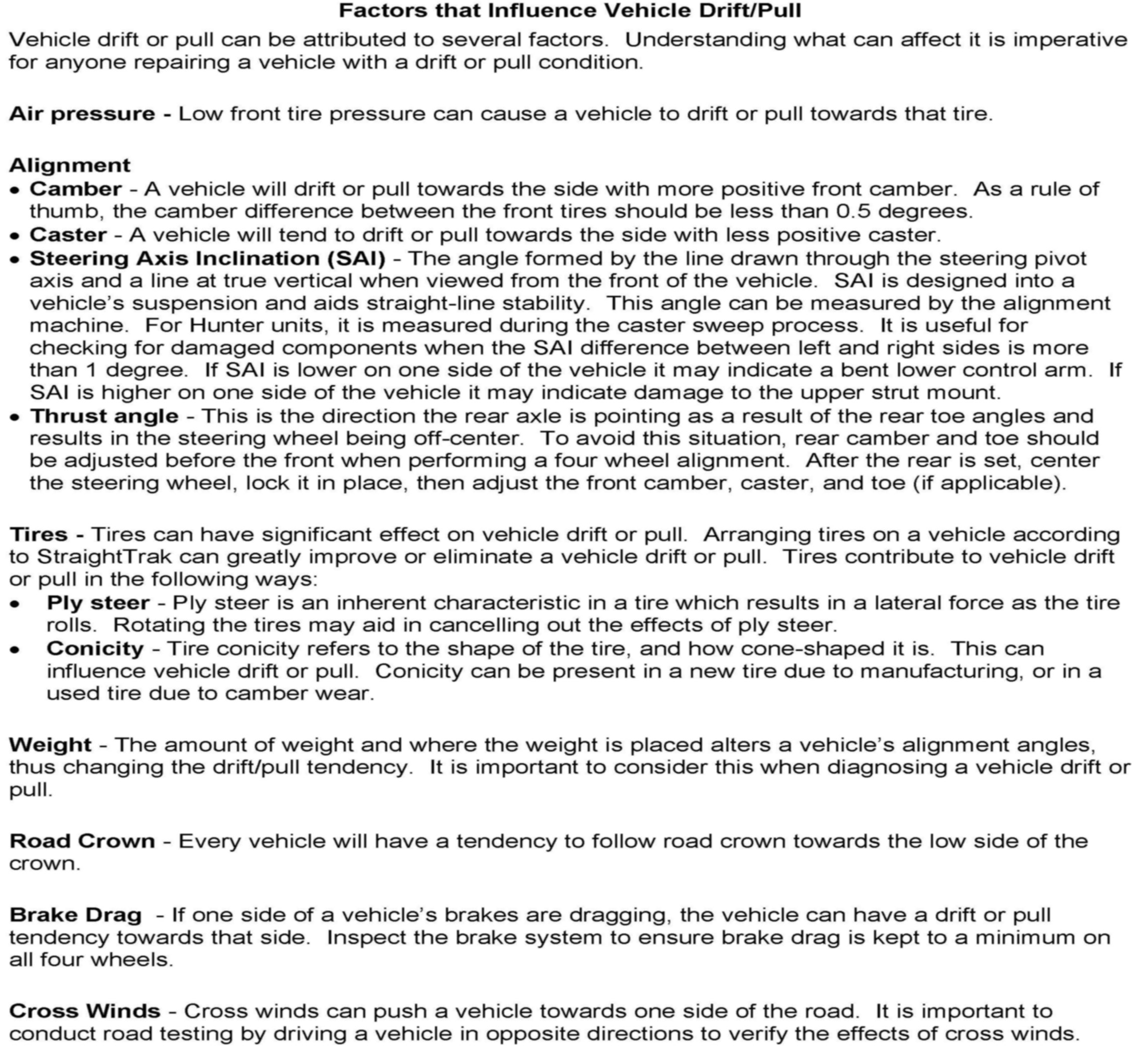 ^ Many issues can contribute to vehicle drift or pull, such as tire pressure, tire uniformity, wheel alignment, brake drag, road crown, cross winds, spring sag resulting in ride height differences, cargo load/weight distribution, and more.