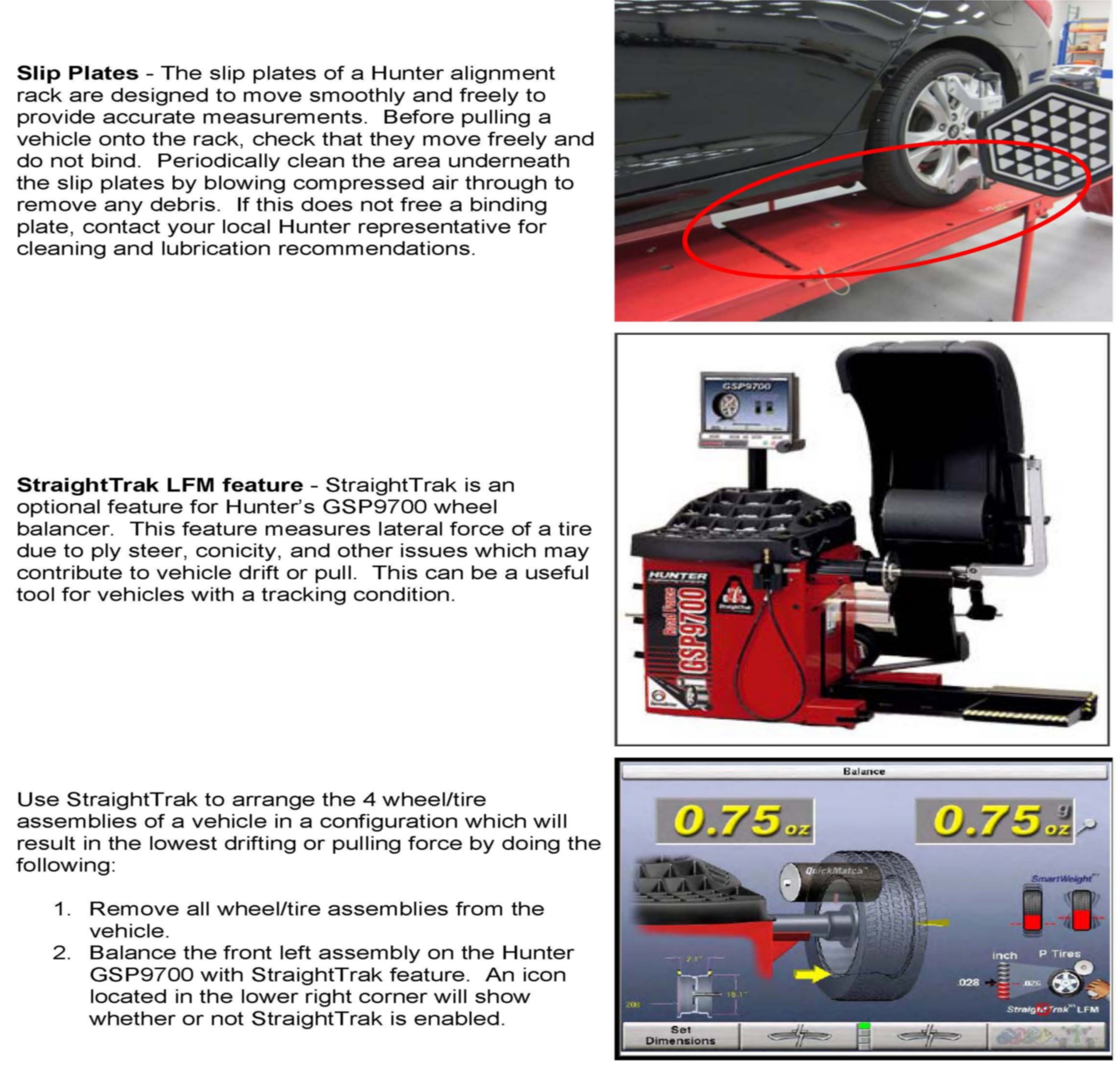 ^ To perform proper vehicle drift or pull diagnosis, access to a Hunter GSP 9700 equipped with StraightTrak is necessary. If you do not have access to such equipment, it may be located through the Hunter website (www.gsp9700.com).