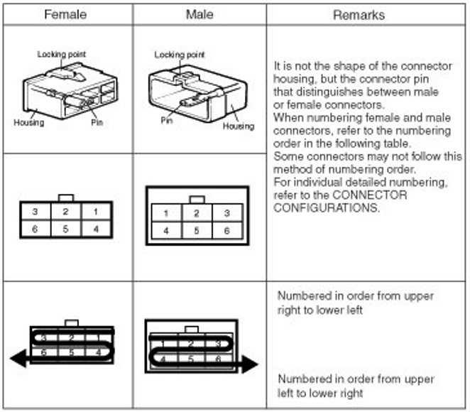 - It shows the front of the connector on the harness side when not to the harness connector. The terminal number on each connector can be obtained by following the pattern used in (5) connector view and numbering order. Unused terminals are marked with an asterisk (*).