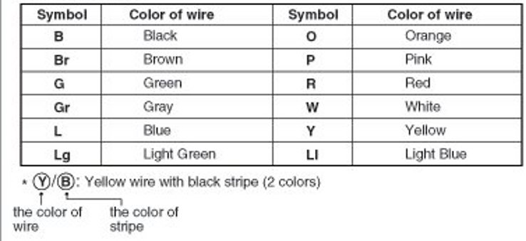 The following abbreviations are used to identify wire colors in the circuit schematics.