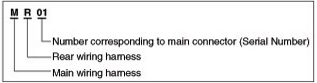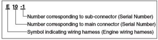 A Connector identification symbol consists of a wiring harness location classification symbol corresponding to a wiring harness location and number corresponding to the connector.