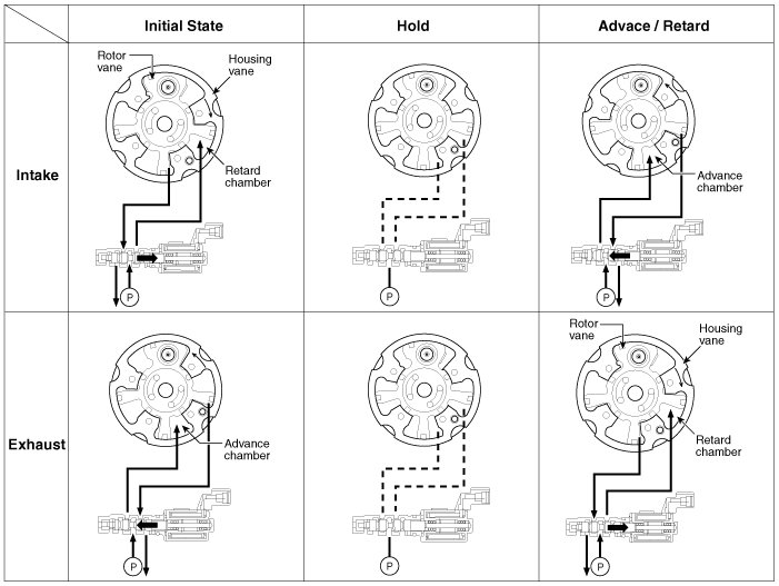 The engine oil getting out of the CVVT oil control valve varies the cam phase in the direction (Intake Advance/Exhaust Retard) or opposite direction (Intake Retard/Exhaust Advance) of the engine rotation by rotating the rotor connected with the camshaft inside the cam phaser.