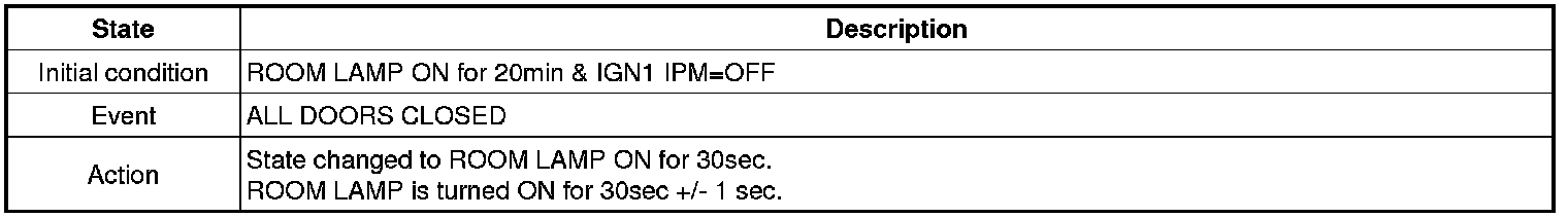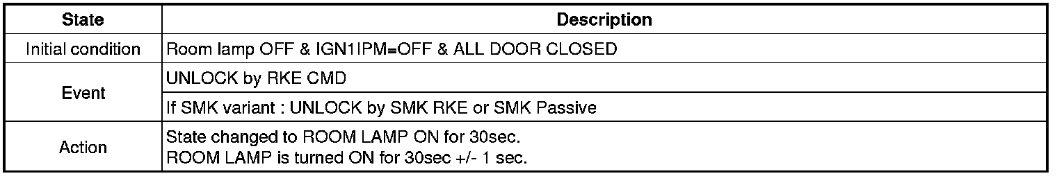 Any door opens at terminal OFF state without FOB in. After transition to all door closed within 500msec, if the valid Fob is in side car and all door locked then IPM transmits SMK key reminder warning 2 command (SMK Warning