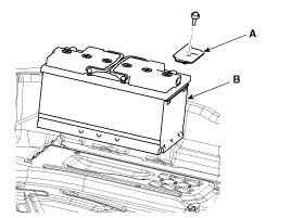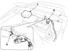 1. Disconnect the battery sensor connector (A) then battery negative terminal (B) and positive terminal (C).