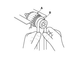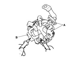 1. Make sure there is no continuity between the (+) brush holder (A) and (-) plate (B). If there is continuity, replace the brush holder assembly.