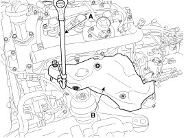 3. Remove the oil level gauge tube (A) and the LH exhaust manifold heat protector (B).