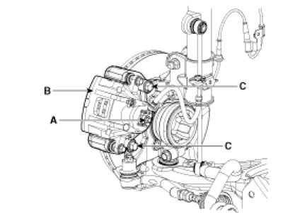 2. Loosen the hose eye-bolt (A) and caliper mounting bolts (C), then remove the front caliper assembly (B).