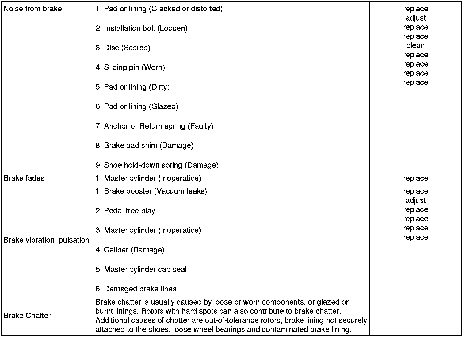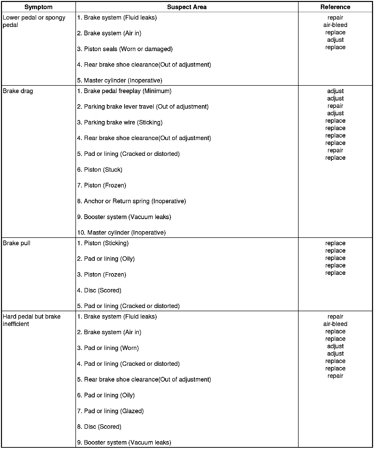 Problem Symptoms Table