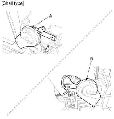 2. Remove the bolt and disconnect the horn connector, then remove the high pitch horn (A) and low pitch horn (B).