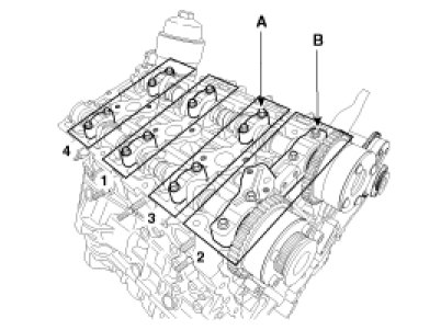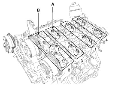 5. Install the LH/RH camshaft bearing cap (A) and thrust bearing cap (B).