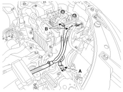9. Remove the radiator upper hose (A) and lower hose (B).