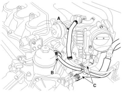 12. Disconnect the PCSV hose (A), fuel hose (B) and the heater hoses (C).