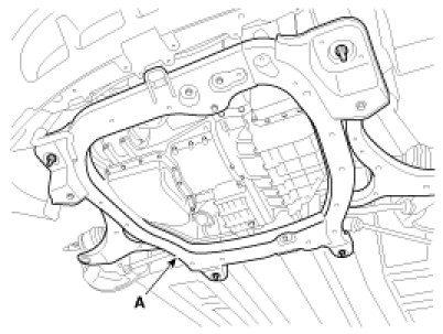 20. Support the sub frame (A) with a floor jack, and then remove the sub frame mounting bolts.