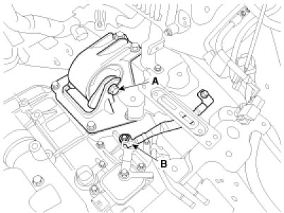 22. Disconnect the ground cable, and then remove the transaxle mounting bracket through bolt (A).