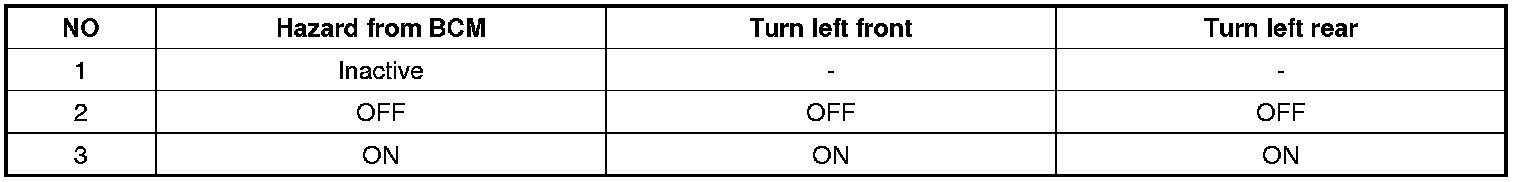 - All turn signal lamps are turned off when 'Hazard from BCM = Inactive or OFF'. But inactive means that there's no more control from BCM not switch.