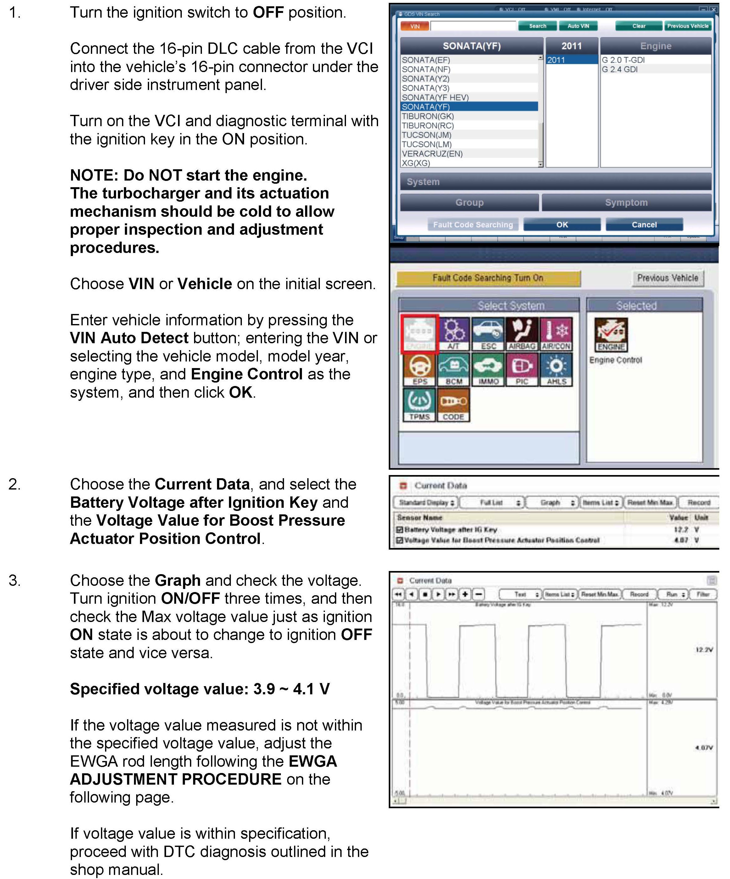 On some 2011-2012 model year Sonata vehicles equipped with the 2.0T (turbo-GDI) engine, the malfunction indicator light may illuminate with DTC P2562 Turbocharger Boost Control Position Sensor "A" Circuit. This bulletin describes the procedure to inspect the voltage value for