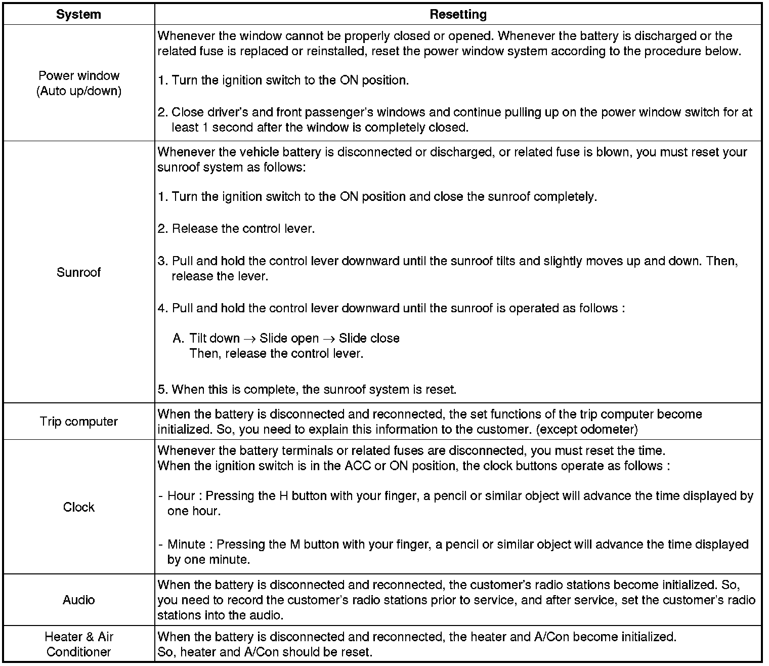 When reconnecting the battery cable after disconnecting, recharging battery after discharged or installing the memory fuse located on the driver's side panel after removing, be sure to reset systems mentioned in the below table.
