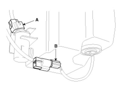 3. Remove the washer hose and disconnect the washer motor connector (A) and level sensor connector (B).
