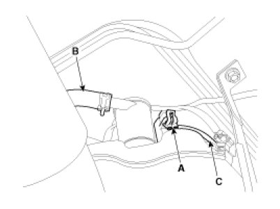 6. Release the lever (A), and then separate the canister close valve (B) from the fuel tank air filter (C) after rotating it in the direction of the arrow in the figure.