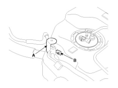 5. Remove the fuel tank air filter and canister close valve assembly (A) after removing the mounting nut (B).