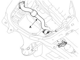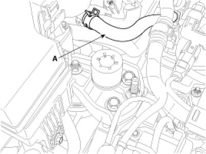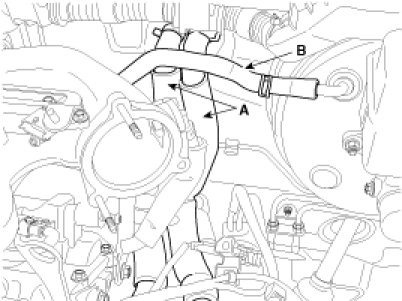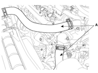 10. Remove the upper radiator hose and lower radiator hose(A).