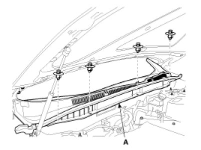2. Remove the weather strip and the cowl top cover (A) after removing 4 retainers.