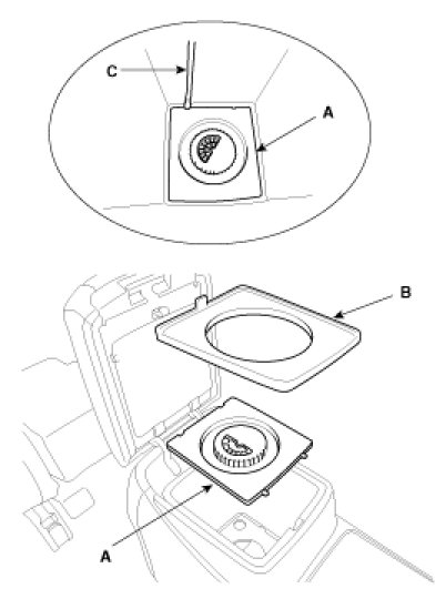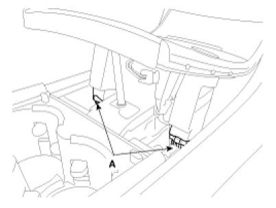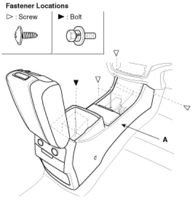 8. After loosening the console mounting screws, remove the floor console assembly (A).