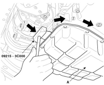2. Using the SST(09215-3C000) remove the lower oil pan(A).