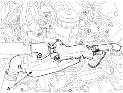 7. Install the intake manifold(A) and the surge tank.