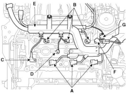 (1) Disconnect the RH front and rear oxygen sensor connectors(A), the power steering sensor connector(B), the RH injector harness connector(C) and the VIS solenoid valve connector(D).