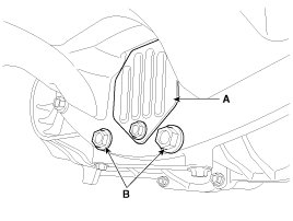 2. Remove the dust cover (A) on the bottom of the upper oil pan and unfasten the two transaxle mounting bolts (B).