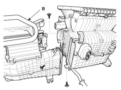 5. Remove the blower unit (B) from the heater unit after loosening a mounting bolt and 3 screws.