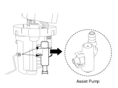 4. Separate the assist pump with hose (A) with the two fixing hooks (B) disengaged.