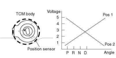 The shift position sensor is integrated in TCU. TCU indicates a shift position by reading a voltage difference between output voltages (Pos1,Pos2) from the shift position sensor.