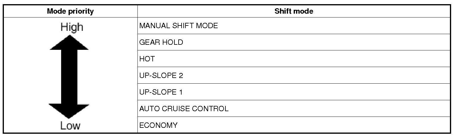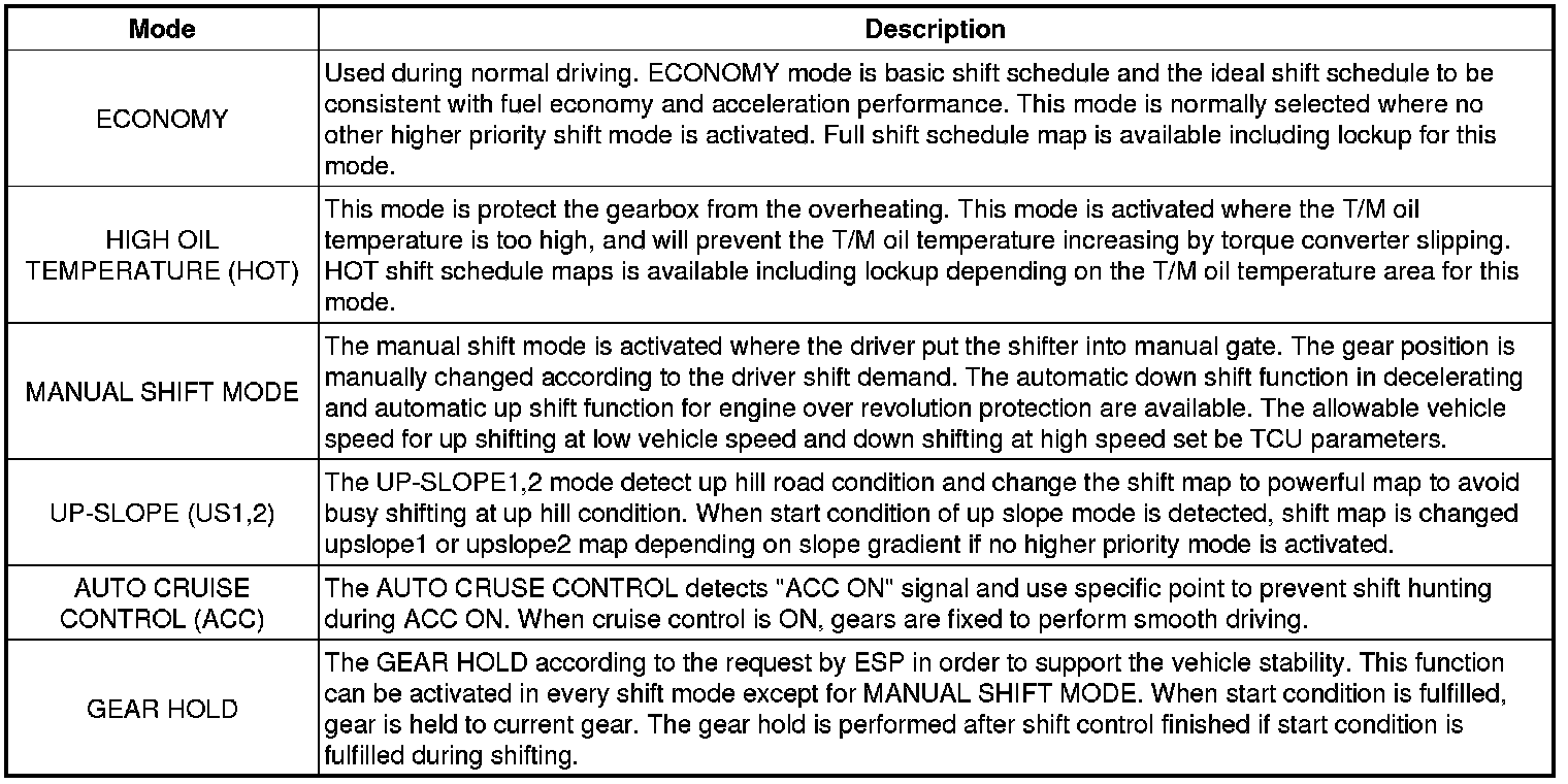 The F21 for HMC does not have a driving mode selection switch that allows drivers to select a mode themselves. The vehicle is ordinarily in economy mode. However, when specific conditions are met, the TCU selects a shifting pattern appropriate to driving conditions from all of the shifting patterns and switches automatically.