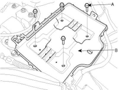 5. Remove the battery tray (B) by removing the four bolts (A).