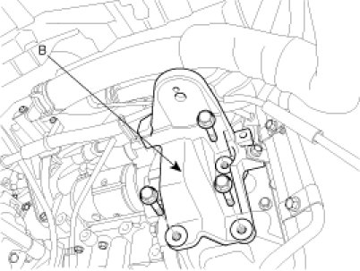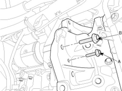 2. Install the starter motor mounting bolt (A) and the transaxle mounting bolt (B).