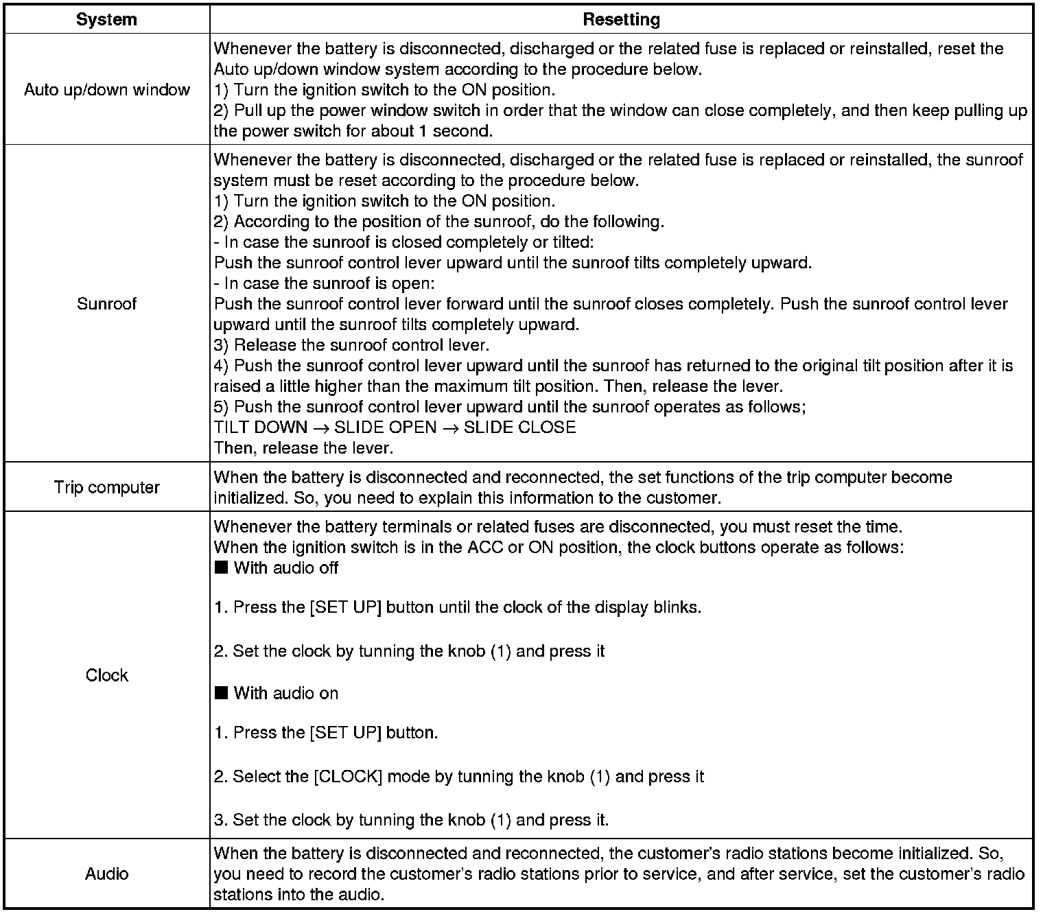 When reconnecting the battery cable after disconnecting, recharging battery after discharged or installing the memory fuse located on the driver's side panel after removing, be sure to reset systems mentioned in the below table.