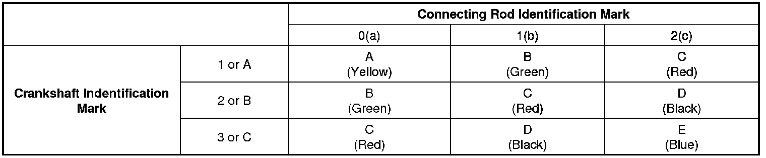 (6) If the plastigage measures too wide or too narrow, remove the upper half of the bearing, install a new, complete bearing with the same color mark (select the color as shown in the next column), and recheck the clearance.