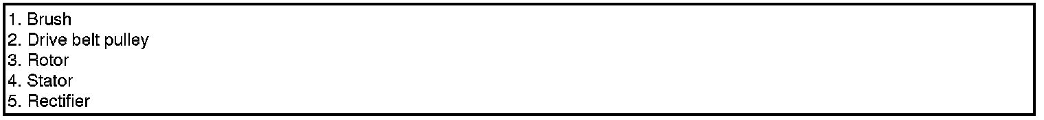 The alternator is regulated by the battery voltage detection system. The main components of the alternator are the rotor, stator, rectifier, capacitor brushes, bearings and V-ribbed belt pulley. The brush holder contains a built-in electronic voltage regulator.
