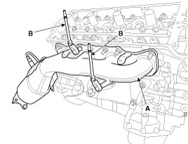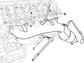 NOTE: Use an universal joint wrench (B) to loosen the upper and lower nuts on the RH exhaust manifold.