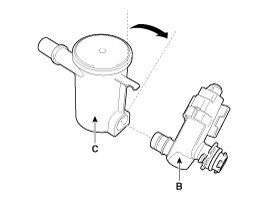 9. Release the lever (A), and then separate the canister close valve (B) from the fuel tank air filter (C) after rotating it in the direction of the arrow in the figure.
