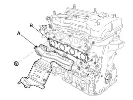 Remove the exhaust manifold (A) with the gasket (B).